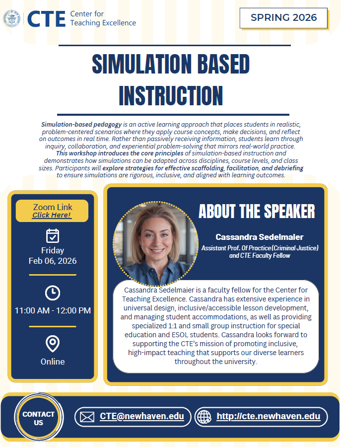 To view recordings and presentation slides (where applicable) of any past virtual events, please Workshop Recordings. Please note, workshop recordings are posted in reverse chronological order. each poster notes the event date. Contact cte@newhaven.edu with any questions.