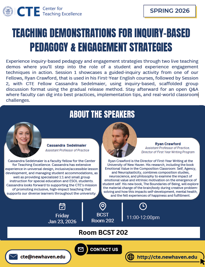 Experience inquiry-based pedagogy and engagement strategies through two live teaching demos where you’ll step into the role of a student and experience engagement techniques in action. Session 1 showcases a guided-inquiry activity from one of our Fellows, Ryan Crawford, that is used in his First-Year English courses, followed by Session 2, with CTE Fellow Cassandra Sedelmaier, using inquiry-based, scaffolded group discussion format using the gradual release method. Stay afterward for an open Q&A where faculty can dig into best practices, implementation tips, and real-world classroom challenges.