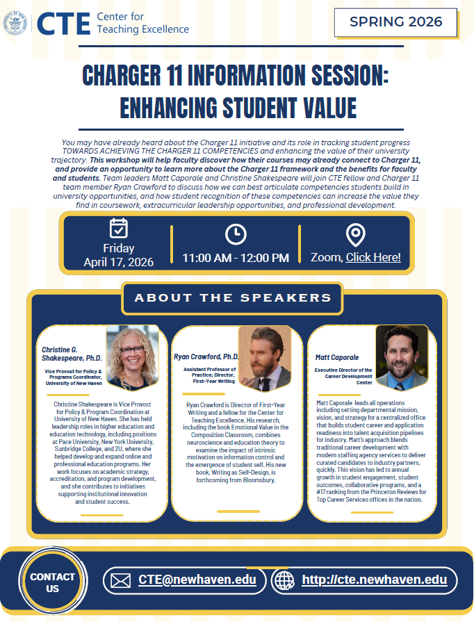 You may have already heard about the Charger 11 initiative and its role in tracking student progress TOWARDS ACHIEVING THE CHARGER 11 COMPETENCIES and enhancing the value of their university trajectory. This workshop will help faculty discover how their courses may already connect to Charger 11, and provide an opportunity to learn more about the Charger 11 framework and the benefits for faculty and students. Team leaders Matt Caporale and Christine Shakespeare will join CTE fellow and Charger 11 team member Ryan Crawford to discuss how we can best articulate competencies students build in team member Ryan Crawford to discuss how we can best articulate competencies students build in university opportunities, and how student recognition of these competencies can increase the value they find in coursework, extracurricular leadership opportunities, and professional development.